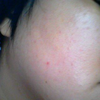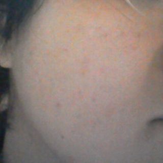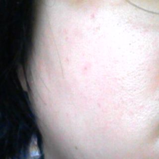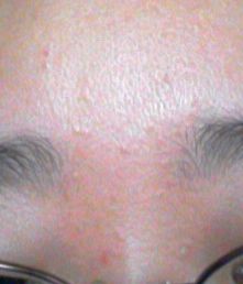 額のデコボコニキビ、頬の赤ニキビ、ともに依然として存在しています。
