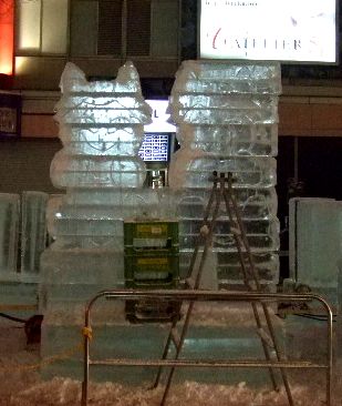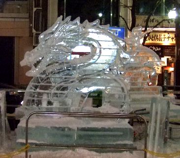 おお、雪祭りのすすきの会場の氷像を作っているよ。パシャパシャ。
