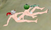 変態さんは、白褌にスイカ頭、りぼん、豚の鼻、素肌にバッヂという