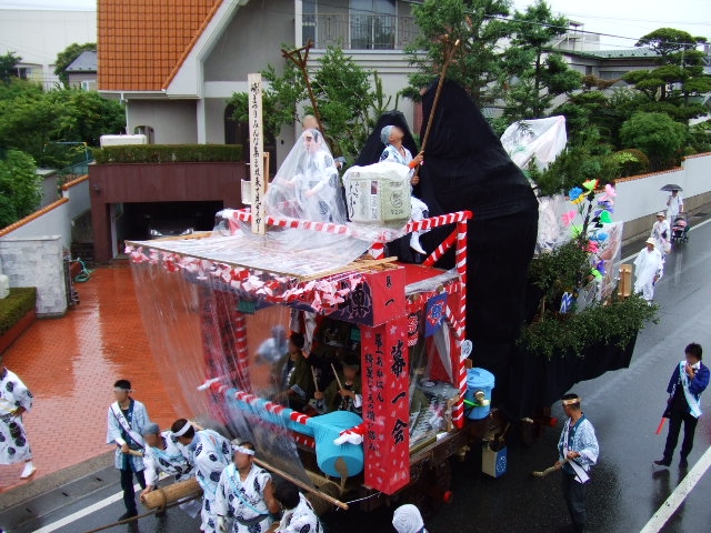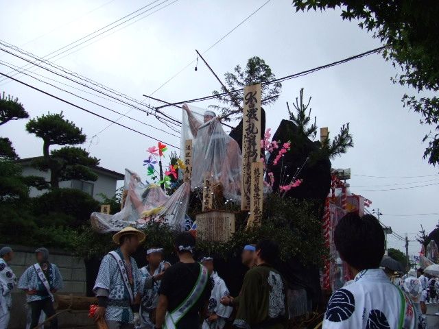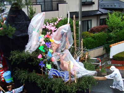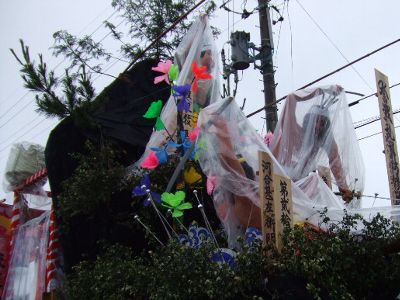…ですがあいにくの雨で、山車のお人形がビニールかぶってるんです。